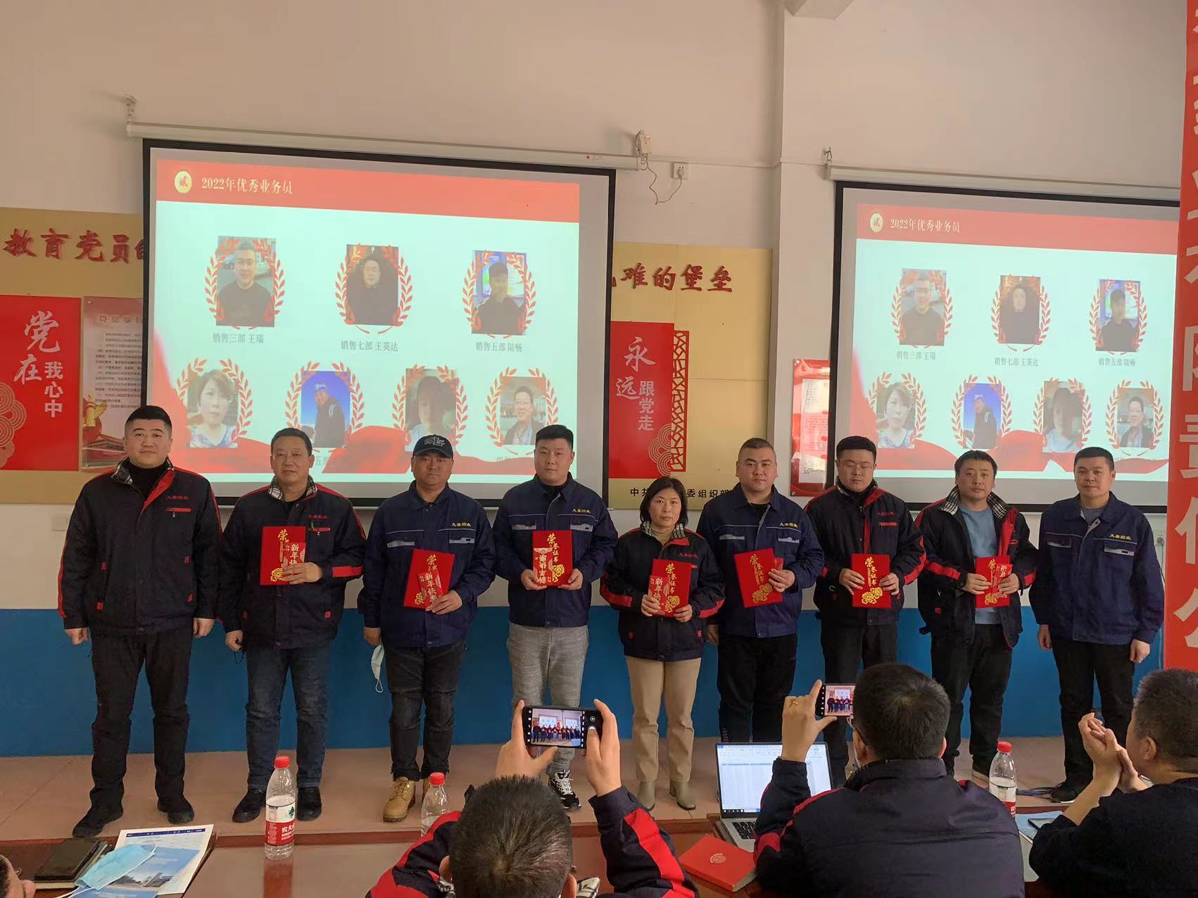 本次會議對2022年度取得較好業(yè)績的優(yōu)秀業(yè)務(wù)員、優(yōu)秀內(nèi)勤及優(yōu)秀班組進(jìn)行了表彰,對他們在2022年付出的艱辛和努力給予肯定,號召大家以優(yōu)秀為榜樣,向他們看齊。為了確保高質(zhì)量完成營銷目標(biāo),在本次會議上,公司總經(jīng)理李百洋與營銷中心總經(jīng)理郭少剛分別與八位總監(jiān)簽署了2023年度崗位聘書及目標(biāo)責(zé)任狀,壓實(shí)各項(xiàng)銷售指標(biāo)的分解與落實(shí)。