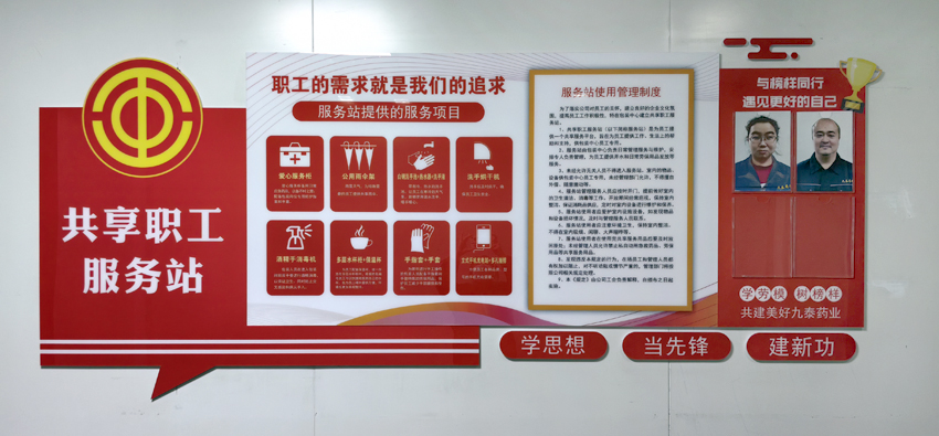 11月25日,公司第一個(gè)共享職工服務(wù)站在包裝中心成立并投入使用。共享職工服務(wù)站文化墻上醒目地提示著共享服務(wù)項(xiàng)目、使用管理辦法,為了豐富文化墻內(nèi)容,還增添了“與榜樣同行遇見(jiàn)更好的自己”優(yōu)秀員工光榮榜。共享職工服務(wù)站內(nèi)共享物品齊全,擺放整齊,共享設(shè)施設(shè)備即符合藥企規(guī)范,也充滿溫馨,充滿愛(ài)意。服務(wù)站提供的服務(wù)項(xiàng)目包括:1、愛(ài)心服務(wù)柜。愛(ài)心服務(wù)柜備用日常應(yīng)急藥品,以備不時(shí)之需;包裝中心員工每天高效、重復(fù)的包裝動(dòng)作很容易被包材劃傷手部,愛(ài)心服務(wù)柜為包裝崗位員工配備了處理傷口的藥品和防護(hù)用品。2、公用雨傘。雨雪天氣,為特殊需要的員工提供共享雨傘。3、白鋼洗手池+熱水器+洗手液。洗手池帶有冷、熱水調(diào)節(jié)開(kāi)關(guān),讓員工在寒冷的天氣里,能夠使用溫水洗手,暖手暖心。4、洗手烘干機(jī)。員工進(jìn)入操作間洗手后及時(shí)烘干,確保員工衛(wèi)生安全。5、酒精手消毒機(jī)。包裝人員在進(jìn)入包裝間前雙手要進(jìn)行酒精消毒,以保證衛(wèi)生,同時(shí)防止交叉感染和病從手入。6、多層水杯柜+保溫杯。為每一名員工配備了大容量保溫杯,統(tǒng)一存放在多層水杯柜中,根據(jù)姓名、編號(hào),員工可以快捷地找到自己的水杯,為員工喝熱水提供方便,環(huán)境也更加美觀整潔。7、手指套+手套。服務(wù)站為常年進(jìn)行手工操作的包裝人員配備了手指套和手套特殊的勞保用品,保護(hù)員工減少手部磨損和受傷。8、立式手機(jī)充電站+多孔插排。方便員工各種品牌、型號(hào)的手機(jī)充電需要。